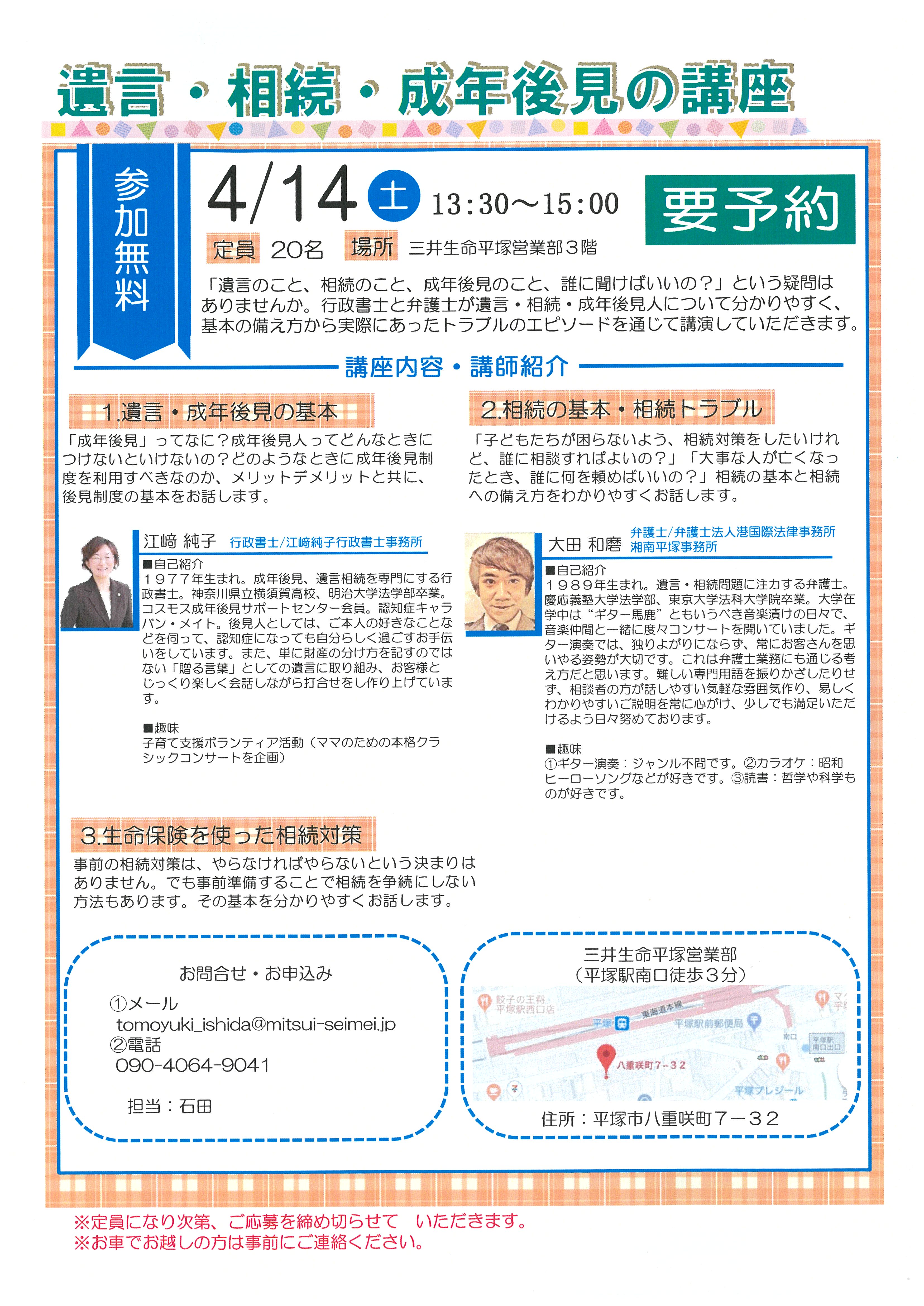 三井生命平塚営業部様にてセミナー講師をさせていただくことになりました! 素敵なちらしを作っていただきました。 私は遺言と成年後見を担当します。 「もしものときに備えで、今できること」が担当ですね。 弁護士さんが、相続トラ […]