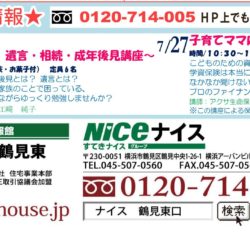 ナイス住まいるcafe鶴見東のちらし7月号イベント情報欄にに載せていただきました! (下のにイベント情報欄の拡大したものを貼っておきます。) ご予約は、住まいるcafe鶴見東へ。 以下をご参照ください。 ~要予約・無料( […]